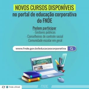 O Fundo Nacional de Desenvolvimento da Educação (FNDE) está disponibilizando 16 opções de capacitação a distância sem tutoria voltado para profissionais da educação em todo o território nacional. Os cursos, com 30 horas cada, abordam assuntos diversos relacionados à educação e ao FNDE, como o Programa Nacional de Alimentação Escolar (PNAE); os programas de transporte escolar; financiamento da educação; o Programa Nacional do Livro e do Material Didático (PNLD); censo escolar; controle social, entre outros. As inscrições são gratuitas e mais informações poderão ser obtidas no site da entidade: www.fnde.gov.br