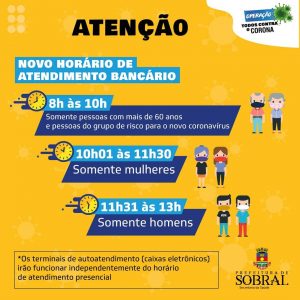 De acordo com o Decreto Municipal n° 2.464, os bancos em Sobral passam a funcionar, a partir desta quarta-feira (15/07), em novo horário, das 8h às 13h. A mudança se dá pela necessidade de começar a abrir as atividades comerciais de acordo com o novo Decreto de Isolamento social estabelecido pelo Governo do Estado. De acordo com o DM 2464, os estabelecimentos comerciais das atividades já liberadas poderão abrir as portas ao público na área central da cidade no período da tarde, a partir das 14h.