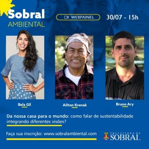 A Agência Municipal do Meio Ambiente está com inscrições abertas para a segunda edição do Webpainel Sobral Ambiental, mais uma online e 100% gratuito. Na edição desse ano, o encontro terá as especiais participações de Bela Gil (apresentadora dos programas Refazenda e Bela Cozinha no Multishow), Ailton Krenak (líder indígena, ambientalista e escritor) e Bruno Ary (diretor de Parques, Jardins e Unidades de Conservação da Prefeitura de Sobral).