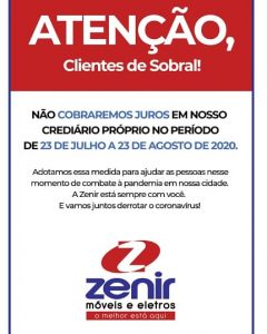 A Zenir Móveis e Eletros, com o intuito de ajudar os sobralenses nesse momento de retomada da economia, que está em sua primeira fase pós isolamento social, resolveu conceder um prazo mais elástico para que as pessoas possam pagar suas prestações em atraso, sem juros, e assim evitar aglomerações como as vistas no entorno de suas lojas na área central de Sobral.