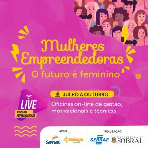 A Prefeitura de Sobral, por meio da Vice-Prefeitura e da Secretaria do Trabalho e Desenvolvimento Econômico (STDE) e Sebrae divulgam a programação do projeto Mulheres Empreendedoras 2020, que contará com oficinas de gestão, motivacionais e técnicas que serão realizadas de forma on-line. A previsão é capacitar, em 4 meses, cerca de 200 mulheres.