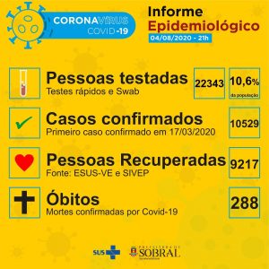 Boletim epidemiológico da Secretaria da Saúde de Sobral desta terça-feira (04/08), atualizado às 21h.