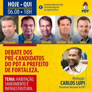 Nesta quinta-feira, 6 de agosto, às 18h, os pré-candidatos do PDT à prefeitura de Fortaleza se encontram para mais um debate. O tema de hoje será Habitação, Saneamento e Infraestrutura. 🏠 O mediado será o presidente Nacional do PDT, Carlos Lupi. O debate será transmitido pelas redes sociais dos candidatos e no Facebook do prefeito Roberto Claudio, do senador Cid Gomes e do vice presidente nacional do partido, Ciro Gomes.