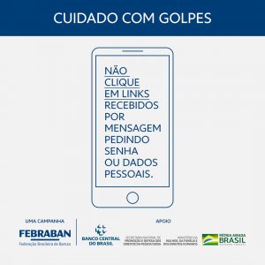 A Federação Brasileira de Bancos tem usado suas redes sociais para alertar os usuários do sistema bancário contra os muitos golpes que tem sido aplicados através da internet.Muito cuidado com emails ou mensagens que receber. Golpistas se passam por amigos, comércios ou até pelo banco e pedem para você clicar em um link, dar sua senha, dados pessoais ou abrir algum arquivo. Se isso acontecer, apague a mensagem e ligue para o gerente do seu banco. Não dê chance pro azar: multiplique os cuidados e não divida sua senha.”, diz a mensagem