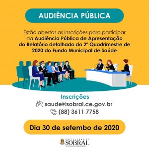 Em cumprimento à Lei Complementar Nº 141, de 13 de janeiro de 2012, que orienta ao gestor do SUS elaborar relatório detalhado a cada quatro meses com informações sobre montante e fonte dos recursos aplicados no período, a Secretaria da Saúde de Sobral realizará uma Audiência Pública (on-line) de apresentação do relatório detalhado do 2º quadrimestre de 2020 do Fundo Municipal de Saúde. O evento ocorrerá na próxima quarta-feira (30/09), a partir das 9 horas.