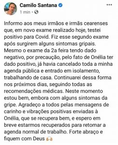 Em postagem no Facebook, o governador Camilo Santana anunciou que o resultado de exames feitos nesta quarta-feira (7), deram resultado positivo para Covid-19. Ele já havia cancelado toda a agenda pública, está em isolamento, com alguns sintomas semelhantes aos de gripe e trabalhando em casa. Agradeceu as mensagens de solidariedade a ele e à primeira-dama Onélia Santana, também, acometida pelo coronavírus.