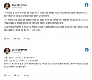 Numa outra publicação, ela negou estar contra o presidente. “Não sou louca de estar contra ele. Eu sou a louca que quer entender pq (sic) todos os bolsonarista (sic) estão sendo expurgados do governo Bolsonaro”, escreveu.