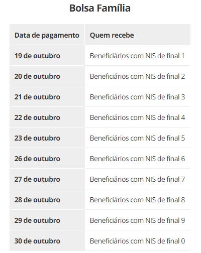 O calendário de pagamentos segue a ordem do dígito final do número do NIS, habitual do programa, sempre nos dez últimos dias úteis do mês. Na segunda, recebem 1,6 milhão de beneficiários com NIS de final 1 e assim por diante (veja calendário completo) até 30 de outubro.