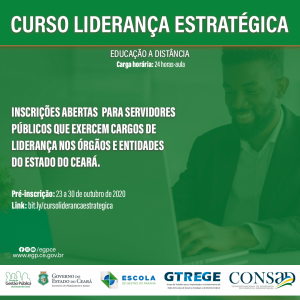 Servidores públicos que exercem cargos de liderança nos órgãos e entidades do poder executivo estadual podem realizar, no período de 23 a 30 de outubro, a pré-inscrição para o curso a distância sobre Liderança Estratégica. A pré-inscrição pode ser feita neste formulário online AQUI (https://bit.ly/cursoliderancaestrategica).