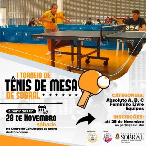 Dia 28 de novembro, no Centro de Convenções de Sobral, a partir das 8 horas, acontece o 1º Torneio de Tênis de Mesa de Sobral. As inscrições podem ser feitas até quarta-feira, 25 de novembro, através de contato com a Associação Sobralense de Tênis de Mesa via instagram (@assc.stm) 📲