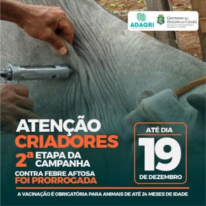 Alô, criadores de bovinos e bubalinos do Ceará! A segunda etapa da campanha de vacinação contra a febre aftosa foi prorrogada até o próximo dia 19. A meta da campanha, segundo informa o Ministério da Agricultura, que a promove, é vacinar 950 mil bovinos e bubalinos, ou 40% do rebanho cearense, que não se imunizaram durante a primeira etapa. A vacinação é obrigatória para animais com até 24 meses de idade.