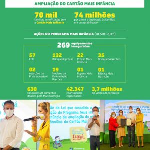 O governador Camilo Santana anunciou, nesta terça-feira (5), a ampliação do número de famílias beneficiadas pelo Cartão Mais Infância Ceará. A partir de agora, aproximadamente 70 mil mães com filhos na primeira infância serão contempladas com o benefício, o que representa investimento superior a R$ 74 milhões por ano. Uma ampliação de 45% em relação às 48 mil famílias atendidas em 2020. O anúncio aconteceu durante a solenidade virtual de sanção da nova lei do Programa Mais Infância Ceará, que atualiza e consolida a iniciativa como política pública de Estado. A vice-governadora Izolda Cela, a primeira-dama Onélia Santana, e a secretária Socorro França (SPS), também participaram da cerimônia.