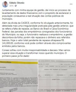 Com apenas oito dias no comando da prefeitura de Coreaú, o prefeito Edézio Sitonio usou as redes sociais para externar a sua indignação com o quadro caótico em que recebeu a chefia do executivo municipal depois de quatro anos de gestão de Carlos Roner.