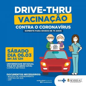Neste sábado, 6 de março, acontece o 2º drive-thru para vacinação de idosos. Agora, os que estão com 79 anos. A ação acontece das 8h as 12h, no estacionamento interno da Universidade Estadual Vale do Acaraú (UVA), campus Betânia.