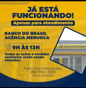Após luta hercúlea do ex-prefeito Francisco Fonteles e do deputado federal Leônidas Cristino, a agência do Banco do Brasil de Meruoca voltou a funcionar nessa semana. A agência havia sido destruída durante uma explosão causada por bandidos que ali estiveram praticando assalto. Não havia mais interesse da instituição em manter a agência, mas a luta das lideranças políticas locais foram convincentes e o banco coltou atrás.