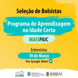 A Secretaria da Educação de Sobral divulgou os horários e locais da segunda etapa da seleção de bolsistas do Programa de Aprendizagem na Idade Certa – MAISPAIC. Os candidatos aprovados na primeira etapa participarão de entrevistas, no dia 10 de março, por meio do Google Meet.