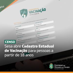 A Secretaria da Saúde do Ceará (Sesa) disponibiliza o Cadastro Estadual de Vacinação pelo site Saúde Digital (www.digital.saude.ce.gov.br) para pessoas a partir de 18 anos que não integram os quatro grupos prioritários especificados no Programa Nacional de Imunização do Ministério da Saúde. O objetivo é consolidar um censo de cearenses que precisam ser vacinados e, assim, promover estratégias eficazes de imunização.