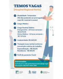 O Hospital Regional Norte (HRN), do Governo do Ceará, administrado pelo Instituto de Saúde e Gestão Hospitalar (ISGH) está com vagas temporárias abertas para médicos emergencistas e de clínica médica. O perfil de atendimento são os pacientes do eixo Covid.