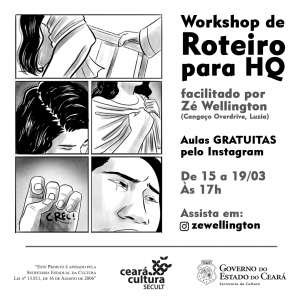 Como parte dos eventos de lançamento de “Luzia”, a nova HQ do sobralense Zé Wellington junto com a Debora Santos, nesta semana ele vai oferecer gratuitamente pelo Instagram, um Workshop de Roteiro para HQ.