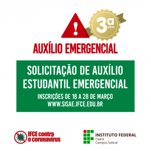 Foi publicado edital do novo processo seletivo para auxílio emergencial a alunos do IFCE Sobral. Para participar da seleção, é preciso estar regularmente matriculado em algum dos cursos técnicos ou superiores do campus. Serão pagas quatro parcelas no valor de R$ 300. A inscrição será entre 18 e 28 de março de 2021, por meio do Sistema Informatizado de Assistência Estudantil (SiSAE): www.sisae.ifce.edu.br.
