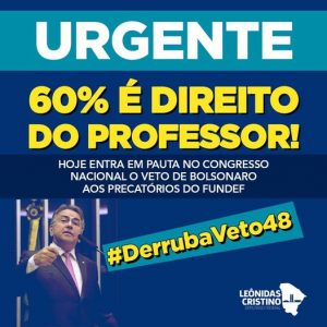 “Não aceitamos este retrocesso. Vamos votar para que 60% do FUNDEF sejam garantidos para os professores. É um direito inalienável da categoria. #DerrubaVeto48”, defendeu o parlamentar sobralense.