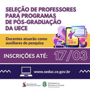 Termina nesta quarta-feira, 17 de março, o prazo para os professores da rede estadual se candidatarem aos programas de pós-graduação stricto sensu (mestrado ou doutorado) da Universidade Estadual do Ceará envolvidos nos eixos de pesquisa: Políticas de Tecnologias Digitais na Educação Básica; Política e Gestão Educacional e Escolar; Educação e Saúde; Currículo, Práticas Pedagógicas e Cidadania Global. A seleção é uma iniciativa da Rede de Cooperação em Pesquisa (Recope), uma parceria entre a Seduc e a Uece. Para saber mais, acesse: www.seduc.ce.gov.br