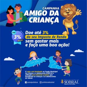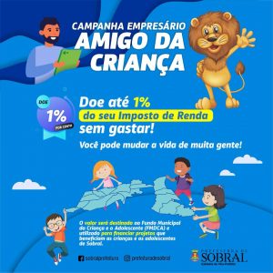 Os contribuintes sobralenses que desejarem já podem destinar um percentual do seu Imposto de Renda de Pessoa Física (IRPF) ou Jurídica (IRPJ) para o Fundo Municipal dos Direitos da Criança e do Adolescente (FMDCA). Durante o período de declarações (até 30/04/2021), pessoas físicas podem destinar até 3% do valor total e pessoas jurídicas 1%.