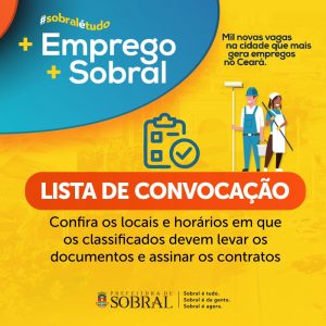 Foi classificado no resultado final do “Mais Emprego, Mais Sobral”? Confira os locais e horário para apresentação dos documentos e assinatura dos contratos no site da Prefeitura de Sobral (https://sobral.ce.gov.br). A Prefeitura lembra que essa é a primeira convocação. Serão 400 pessoas em abril (380 da ampla concorrência e 20 pessoas com deficiência), 300 em maio e 300 em junho.