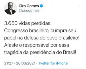 O ex-ministro e pré-candidato do PDT a presidência da República, Ciro Gomes, segue seu ataque ao presidente Bolsonaro. Nas suas páginas nas redes sociais , o ex-governador escreveu: “3.650 vidas perdidas. Congresso brasileiro, cumpra seu papel na defesa do povo brasileiro! Afaste o responsável processa tragédia da presidência da República”.