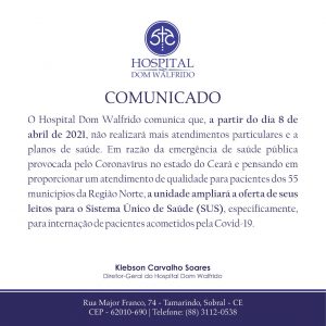 A Assessoria de Imprensa da Santa Casa de Sobral disponibilizou na manhã desta quarta-feira (7), uma Nota ao público tratando das mudanças que serão implementadas no Hospital Dom Walfrido, que a partir desta quinta-feira, 8 de abril, deixa de atender particulares e planos de saúde.