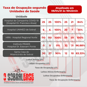 Dos 171 leitos de UTI existentes em Sobral, apenas 3 estão desocupados na Santa Casa de Sobral. Dos 148 leitos de enfermaria, apenas 20 estão desocupados, sendo a maioria deles, 13, no Hospital da Unimed, o único que não faz parte da rede pública.