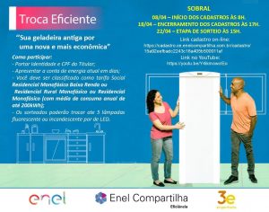 A ENEL Compartilha Eficiência irá realizar mais uma etapa do seu projeto de troca de geladeiras em Sobral. O evento será realizado entre os dias 08/04 até o dia 18/04, através do preenchimento do formulário eletrônico, disponível AQUI – https://bit.ly/3s1yuTR