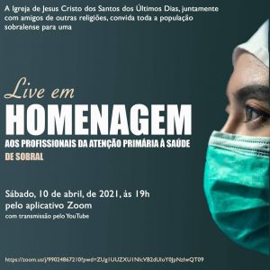 A Igreja de Jesus Cristo dos Santos dos Últimos Dias, de Sobral, convidou amigos de outras religiões, para juntos, viverem a verdadeira religião ensinada por Jesus Cristo, o amor, o serviço, o respeito e a gratidão! Então, no próximo sábado, dia 10 de abril, será realizada uma ‘live’ em homenagem aos profissionais da atenção primária à saúde de Sobral! Acreditamos que eles são verdadeiros heróis e que são merecedores dessa homenagem! Convidamos a população sobralense a se unir a nós, participando desse lindo evento.