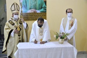 Antes do inicio da celebração, Pe. Airton assinou os documentos de sua posse e de ereção da paróquia. O decreto de Ereção Canônica foi lido pelo padre Agnaldo Temóteo, Vigário Geral e Pe. Lucas do Nascimento – Pároco de São José, leu o decreto de posse do novo pároco.