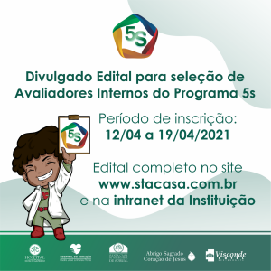 O Complexo Santa Casa de Misericórdia de Sobral divulgou edital para seleção de Avaliadores Internos que possam atuar no Programa 5S do Hospital do Coração de Sobral. O processo seletivo é aberto a todos os profissionais dos serviços administrativos e assistenciais do Complexo. As inscrições serão realizadas de 12 a 19 de abril de 2021, através do envio da Ficha de Inscrição preenchida para o serviço de Gestão da Qualidade.