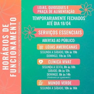 Seguindo as recomendações da Prefeitura, o Sobral Shopping continuará temporariamente fechado até o dia 18/04