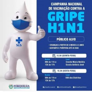 Prefeitura de Forquilha através da secretaria de Saúde de Saúde, anunciando que estará nesta quinta-feira (15/4), iniciando a Campanha de Vacinação contra a Gripe H1N1.