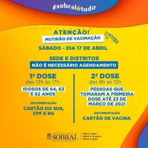 A Prefeitura de Sobral recebeu, nesta sexta-feira (16/04), um novo lote com 3.875 doses, que serão destinadas a mais um mutirão vacinação contra a Covid-19, neste sábado (17/04). Receberão a primeira dose do imunizante idosos de 62, 63 e 64 anos; e segunda dose da Coronavac/Butantan pessoas que tomaram a primeira até o dia 23 de março. De acordo com a Secretaria Municipal da Saúde (SMS), expectativa é de que mais 6.800 sobralenses sejam vacinados.