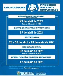 A Prefeitura de Forquilha, através da secretaria de Administração e Planejamento, divulga o cronograma do Processo Seletivo Simplificado para a contratação de vários profissionais a atuarem na administração municipal. O resultado preliminar sairá nesta sexta-feira (23). Fiquem atentos!