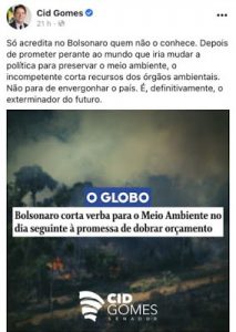O senador Cid Gomes foi às redes sociais para comentar o corte de R$ 240 milhões no orçamento da união nos recursos para preservação da Amazônia. “Só acredita no Bolsonaro quem não o conhece. Depois de prometer perante o mundo que iria mudar a política para preservar o meio ambiente, incompetentemente corta recursos do órgão ambiental”. O senador cearense afirmou ainda que Bolsonaro não para de envergonhar o país. “É, definitivamente, o exterminador do futuro”, escreveu Cid no seu Facebook