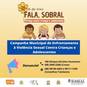 A Prefeitura de Sobral, por meio da Secretaria dos Direitos Humanos, Habitação e Assistência Social (Sedhas), em parceria com demais entidades, realiza, durante o mês de maio, a Campanha de Enfrentamento à Violência Sexual Contra Crianças e Adolescentes.