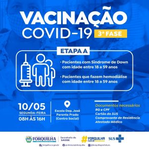 Nesta segunda-feira, 10 de maio, a Prefeitura de Forquilha promove a Etapa “A” da 3ª fase de vacinação contra a Covid-19 para pessoas com Comorbidades.