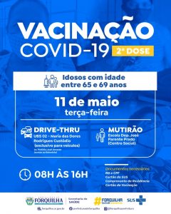 A Secretaria de Saúde de Forquilha realizará, nessa terça-feira (11/05), mais um DRIVE-THRU e MUTIRÃO de VACINAÇÃO contra a Covid-19, somente para aplicação da SEGUNDA DOSE da vacina Coronavac/Butantan nos idosos de 65 a 69 Anos.