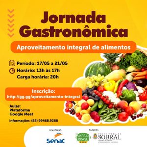 Na próxima segunda-feira (17/05), às 13h, será iniciado o curso gratuito de aproveitamento integral de alimentos, apoiado pela Prefeitura de Sobral, por meio da Secretaria do Trabalho e Desenvolvimento Econômico (STDE). A ação é uma iniciativa do Serviço Nacional de Aprendizagem Comercial (SENAC) e Serviço Social do Comércio (SESC). Os interessados podem se inscrever até domingo (16/05), exclusivamente pela internet, por meio do preenchimento de um formulário eletrônico.