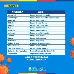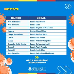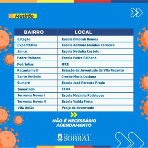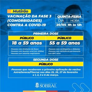 Nesta quinta-feira (20/05), a Prefeitura de Sobral realizará mais um mutirão de vacinação contra a Covid-19.