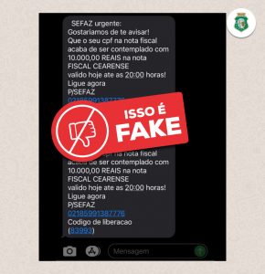A Secretaria da Fazenda do Ceará (Sefaz-CE) alerta sobre mensagens de texto falsas que vêm sendo enviadas via SMS fazendo referência ao programa Sua Nota Tem Valor. As denúncias já foram encaminhadas à Secretaria da Segurança Pública e Defesa Social do Estado do Ceará (SSPDS/CE), para investigação que deverá ser conduzida pela Polícia Civil do Estado do Ceará. A Sefaz também orienta aos contribuintes que foram alvo desse golpe que não retornem a ligação e procurem a delegacia mais próxima de casa para fazer um boletim de ocorrência ou registrem o BO pela Delegacia Eletrônica pelo link.