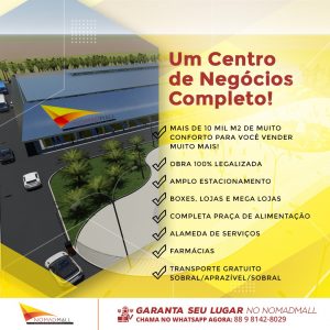 Com previsão de entrega para agosto deste ano e inauguração em setembro, o Nomadmall entra na sua reta final de obras e ganha ares de mega empreendimento as margens da BR 222, no distrito sobralense de Aprazível. Com 10 mil m2 de área, mais de 700 boxes, 30 lojas e estacionamento para 300 veículos, o Nomadmall irá funcionar inicialmente três vezes por semana, recebendo compradores de toda a região e de estados como Piauí e Maranhão, dada a facilidade de acesso e a uma série de incentivos que serão gerados para gerar bons negócios.