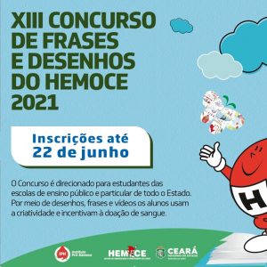Estão abertas, até o dia 22 de junho, as inscrições para o XIII Concurso de Frases e Desenhos, promovido pelo Centro de Hematologia e Hemoterapia do Ceará (Hemoce). Com o tema “Doação de Sangue”, o objetivo é conscientizar estudantes sobre a importância da doação de sangue como um ato voluntário e regular.