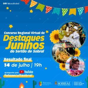 A Prefeitura de Sobral, por meio da Secretaria da Cultura e Turismo (Secult), divulgará, nesta quarta-feira (14/07), o resultado final do Concurso Regional Virtual de Destaques Juninos do Sertão de Sobral, realizado em parceria com a Federação das Quadrilhas Juninas do Ceará (FEQUAJUCE). O evento será transmitido pelo canal da Secult no YouTube, a partir das 19 horas.