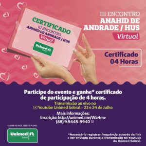 Está chegando o dia do III Encontro Anahid de Andrade, que este ano acontece em formato 100% virtual nos dias 23 e 24 de Julho com transmissão ao vivo no Canal do Youtube da Unimed Sobral. Palestras e Mesa Redondas com diferentes especialistas fazem parte da programação.